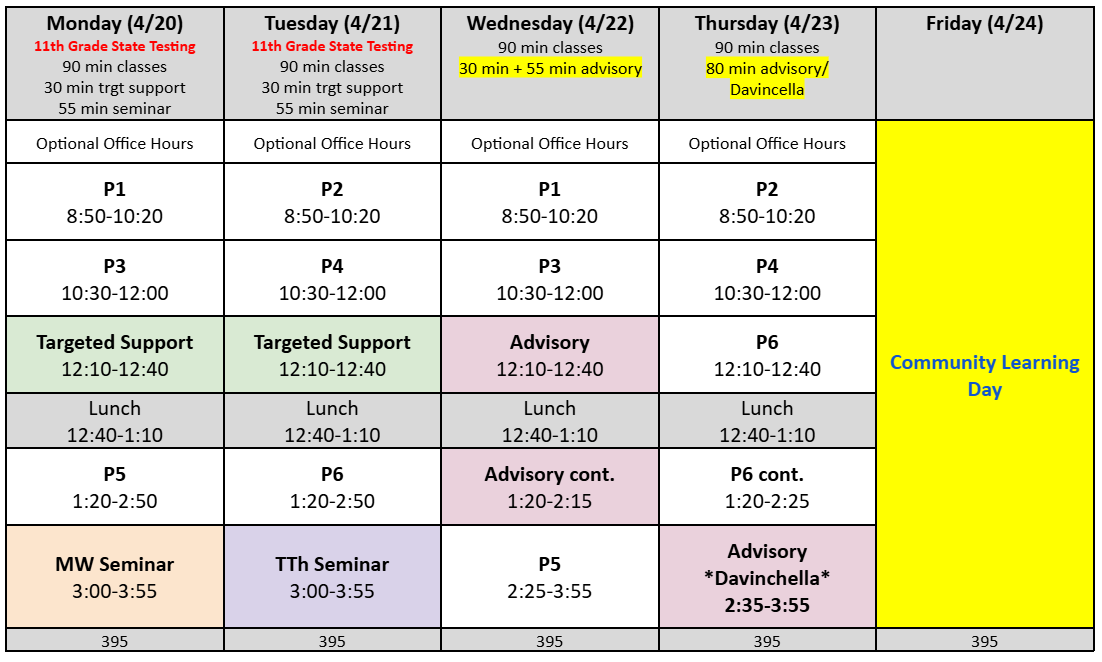 - Monday – Tuesday, 4/20 – 4/21 11th Grade State Testing