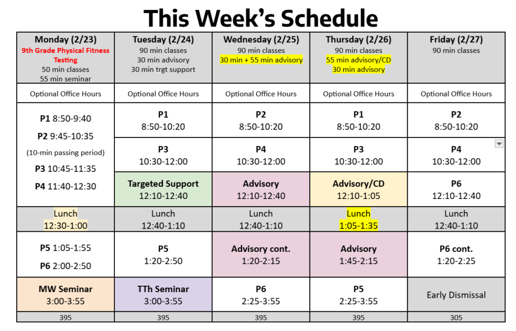 - 9th Grade Physical Fitness Testing: All 9th graders will be taking the PFT on Monday, Feb. 23rd. Please have students come in comfortable clothing and athletic shoes. Please see this PFT letter for more information.