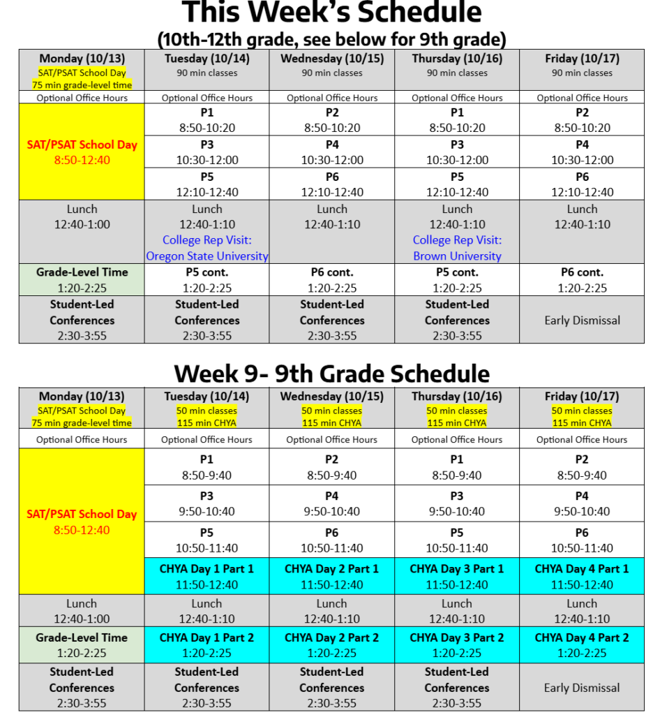 • PSAT/SAT Day: Students in 9-11th will be taking the PSAT; students in 11th and 12th opted-in to take SAT. There will be schedules and room assignments posted throughout the campus on Monday.