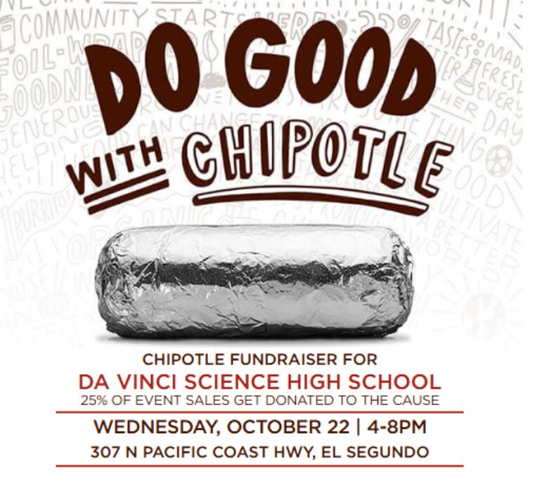 • Advisory Fundraiser at CHIPOTLE 10/22 – share this fundraiser flyer when you order at Chipotle, 307 N Pacific Coast Highway, El Segundo anytime from 4-8pm on WED 10/22.  Every DVS student benefits from our support of DVS Advisory Teachers, so share the flyer with friends and families!