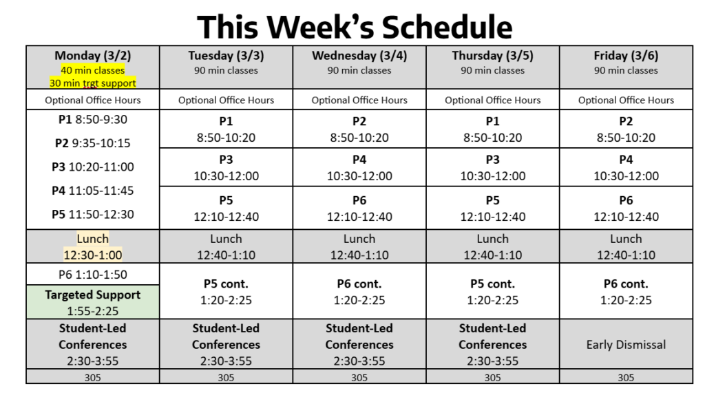 - Monday – Thursday, 3/2 – 3/5: Student-Led Conferences
