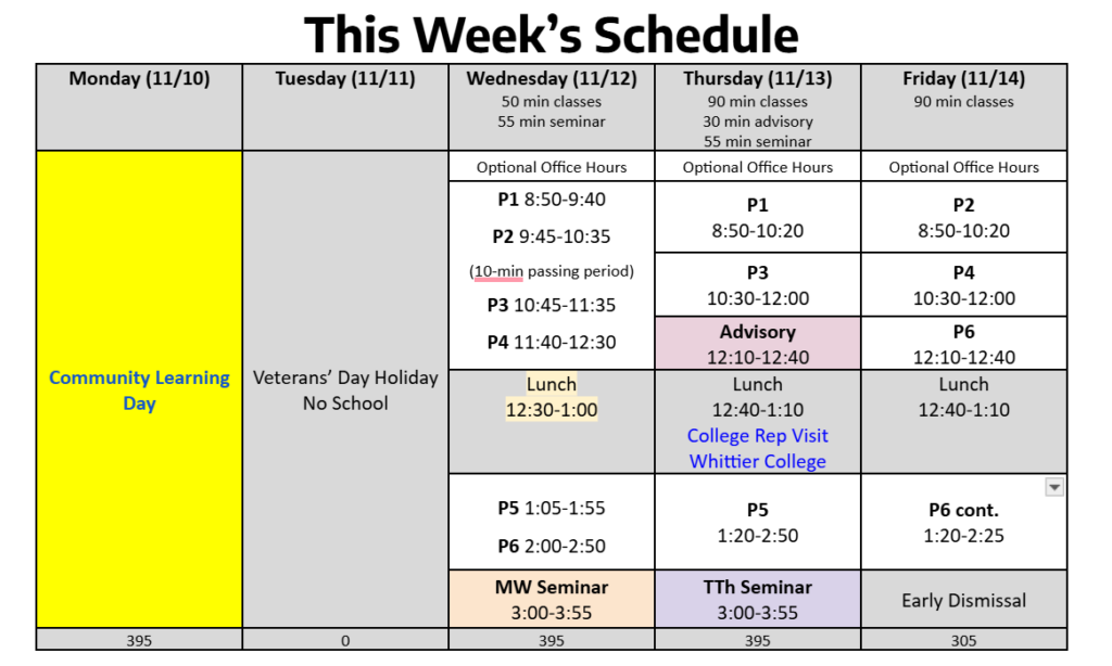 The semester is going by quickly! We only have two more weeks until Thanksgiving break, and then two more weeks after the break until POLs. We hope students continue to engage in their learning to have a strong finish to the semester and enjoy the upcoming breaks.