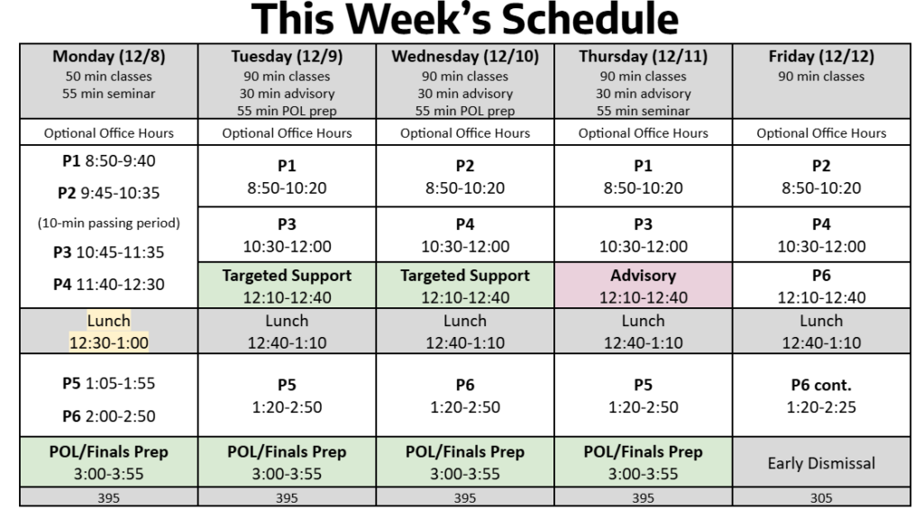 - Presentations of Learning: POL week is coming up, Week 18, 12/15-12/18. Grade Level Teachers provided POL times and assignments. Please see the Presentation of Learning Information for Families Document Fall 2025 for more information on POLs, including links to schedules for 9th, 10th, and 11th grades, as well as the 12th-grade Finals schedule.